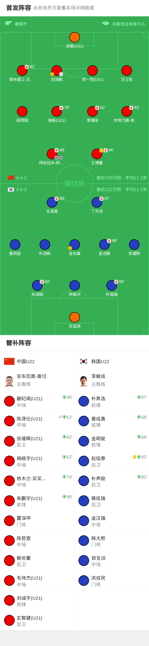 北京时间11月15日19:35,2025CFA中国之队·熊猫杯国际足球锦标赛第2轮在成都双流体育中心体育场继续进行,U22国足对阵韩国U22。比赛中,李镇全进球被吹,随后拜合拉木反击冷静施射+写意脚后跟巧射连下两城梅开二度。最终,U22国足2-0力克韩国U22。