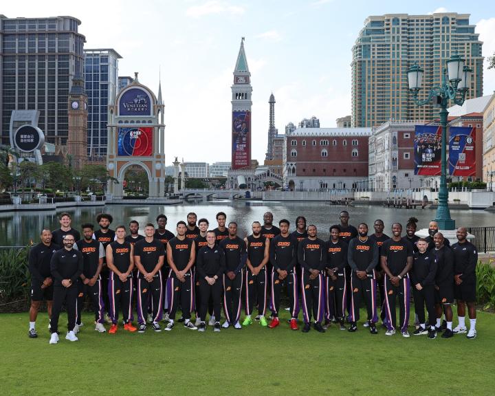 在昨夜的休息以后,太阳队全体球员和工作人员集体在澳门拍摄了球队的大合影,包括主教练乔丹-奥特、球队主将德文-布克、杰伦-格林等全体球员和教练组都在合影之中。